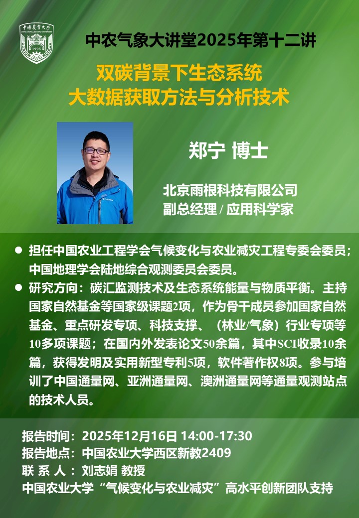 中国农业大学资源与环境学院 学术报告 中农气象大讲堂2025年第十二讲:双碳背景下生态系统大数据获取方法与分析技术-pg直营网